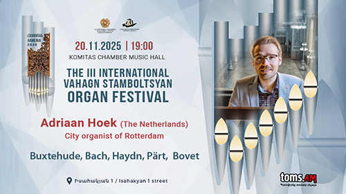 Կոմիտասի անվան կամերային երաժշտության տանը նոյեմբերի 20-ին՝ ժամը 19:00-ին, Վահագն Ստամբոլցյանի անվան երգեհոնային երաժշտության երրորդ միջազգային փառատոնի շրջանակում տեղի կունենա Ռոտերդամի քաղաքային երգեհոնահար Ադրիան Հուկի (Նիդերլանդներ) մենահամերգը: