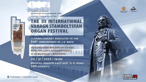 Դեկտեմբերի 6-ին՝ ժամը 19:00-ին, Կոմիտասի անվան կամերային երաժշտության տանը տեղի կունենա Վահագն Ստամբոլցյանի անվան Երգեհոնային երաժշտության երրորդ միջազգային փառատոնի փակման հանդիսավոր համերգը` նվիրված Յոհան Սեբաստիան Բախի 340-ամյակին: