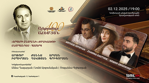 Մենակատարներ Արթուր Իսպիրյանի, Արման Գրիգորյանի, Ժաննա Դավթյանի և կոնցերտմեյստներ Նունե Արզումանյանի, Աննա Ղազարյանի, Ռուզաննա Գրիգորյանի կատարմամբ կհնչեն երգեր ժողովածուից: Ներածական խոսքով հանդես կգա երաժշտագետ Նոնա Ոսկանյանը: