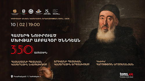Փետրվարի 10-ին՝ ժամը 19:00-ին, Կոմիտասի անվան կամերային երաժշտության տանը տեղի կունենա Հայաստանի պետական կամերային նվագախմբի և Երևանի պետական կամերային երգչախմբի համատեղ համերգը՝ նվիրված հայ նշանավոր հոգևորական, գիտնական, բանաստեղծ, կոմպոզիտոր և Մխիթարյան միաբանության հիմնադիր Մխիթար Սեբաստացու (1676–1749) ծննդյան 350-ամյա հոբելյանին։