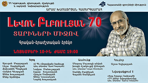 You are invited by the poet, translator, author of many song lyrics, satirist Levon Blbulyan. Don't miss out on the opportunity to enjoy his beautiful songs, heartfelt poetry, good humor, and to celebrate the beloved writer's anniversary. The evening will feature well-known Armenian pop singers, popular actors and reciters.