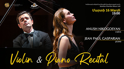 On March 16, at 7:00 PM, a concert by Anush Nikoghosyan, violin, and Jean-Paul Gasparyan, piano (France) will take place at the Komitas Chamber Music Hall.